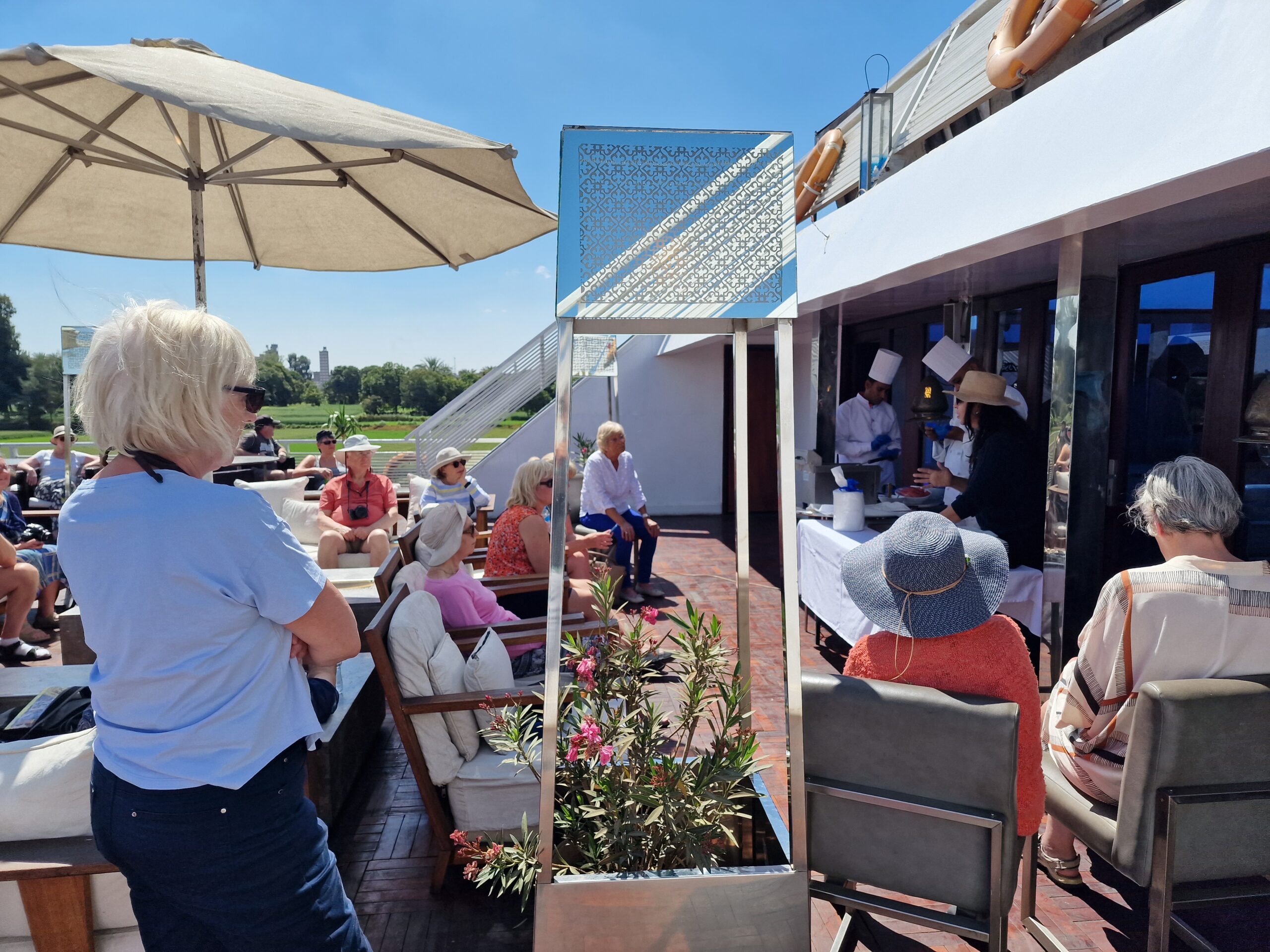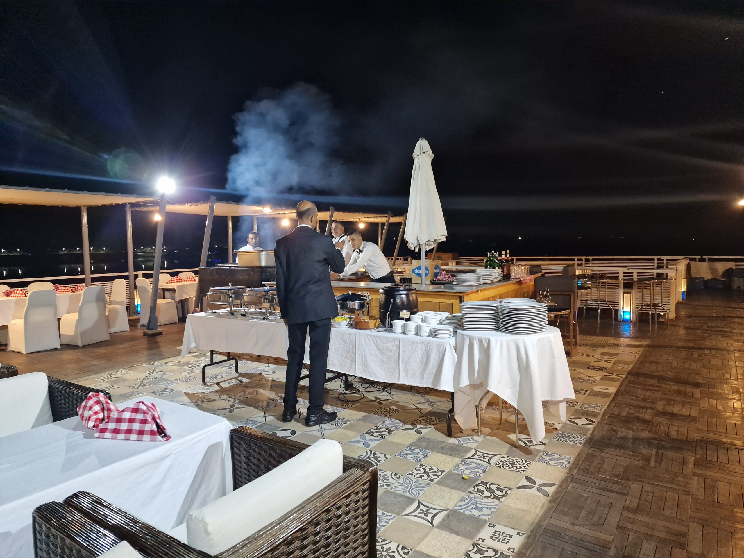 Eftir skoðunarferðir dagsins tékkum við okkur inn á MS Darakum Nile Cruise – 5 stjörnu fljótaskipið sem mun sigla með okkur gegnum Egyptaland næstu 13 dagana og borðum hádegisverð á skipinu.